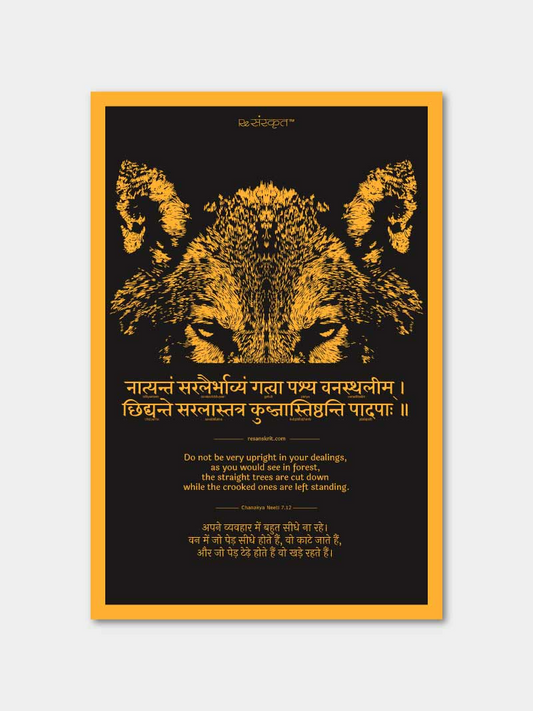 Chanakya warns us never to reveal all of our cards as others may take advantage of that. With a beautiful illustration of a wolf, this artwork is dark, meaningful, and cunning. Source: Chanakya Neeti 7.12 Mantra नात्यन्तं सरलैर्भाव्यं गत्वा पश्य वनस्थलीम्। छिद्यन्ते सरलास्तत्र कुब्जास्तिष्ठन्ति...- From ₹ 249