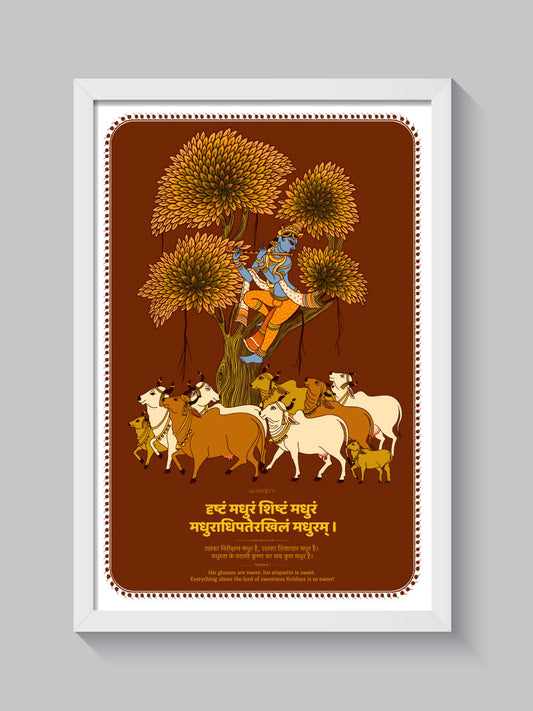 Featuring a beautiful Sanskrit verse on the sweetness of Lord Krishna’s pastimes with the Gopis, this frame is adorned with traditional artwork symbolizing love, devotion, and divine play. Artwork by - Vaishnavi Naik Source: मधुराष्टकम् ७ Mantra गोपी मधुरा लीला मधुरा युक्तं मधुरं मुक्तं...- From ₹ 599