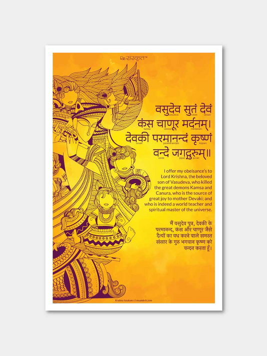'Vasudeva Sutam Devam' is a common prayer across Indian households and devotees of Lord Krishna. With these amazing graphics, this artwork makes a case for itself to be on your wall. Source: Raghuvansham 10.6 Mantra वसुदेवसुतं देवं कंसचाणूरमर्दनम्। देवकीपरमानन्दं कृष्णं वन्दे जगद्गुरुम्॥ Transliteration: vasudevasutaṃ...- From ₹ 249