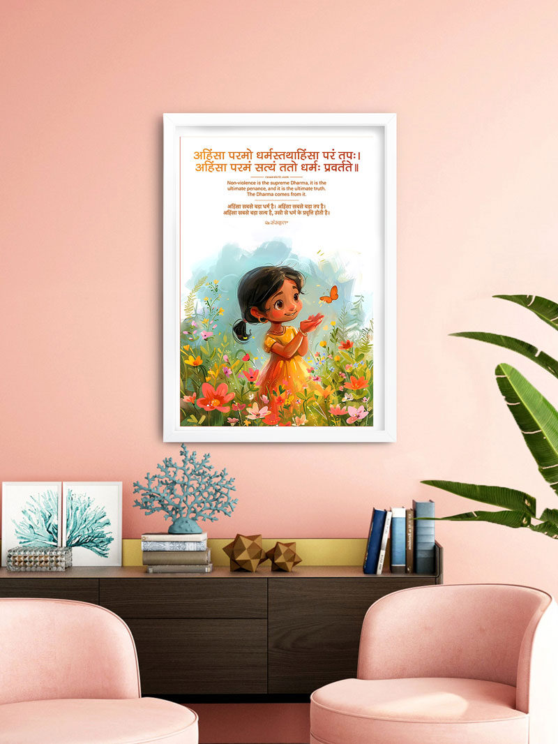 Featuring the powerful Sanskrit verse Ahimsa Parmo Dharma (Non-violence is the supreme Dharma), this frame is adorned with a heartwarming illustration symbolizing peace, kindness, and harmony.