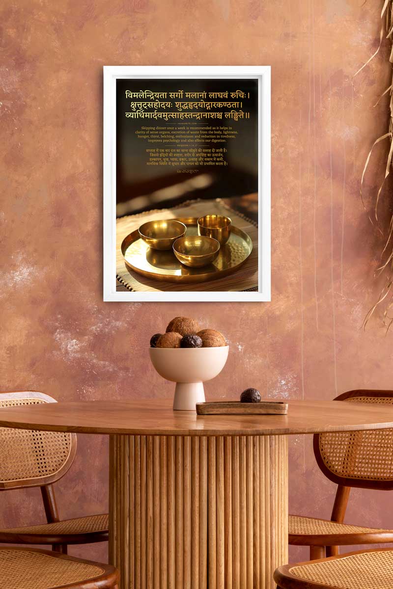 Featuring a Sanskrit verse on the benefits of occasional fasting, this frame includes a serene golden brass plate design, perfect for Ayurvedic clinics and wellness spaces.