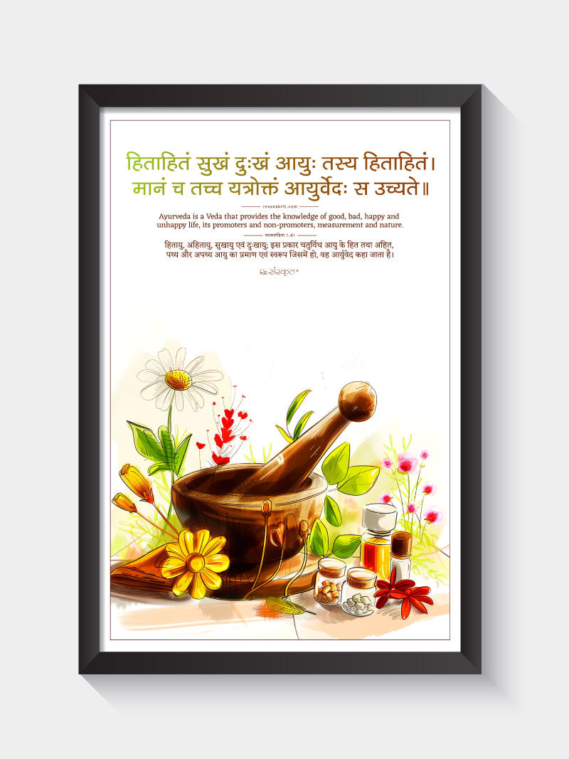 This wall art combines a meaningful Sanskrit verse about Ayurveda with a vibrant illustration of medicinal herbs, ideal for Ayurvedic clinics and wellness centers.
