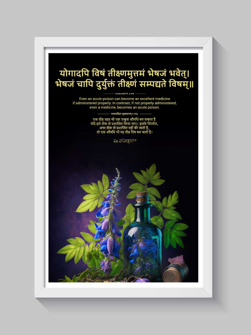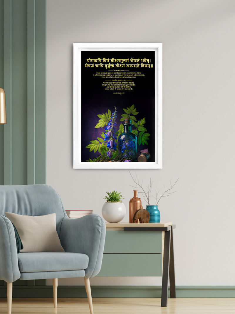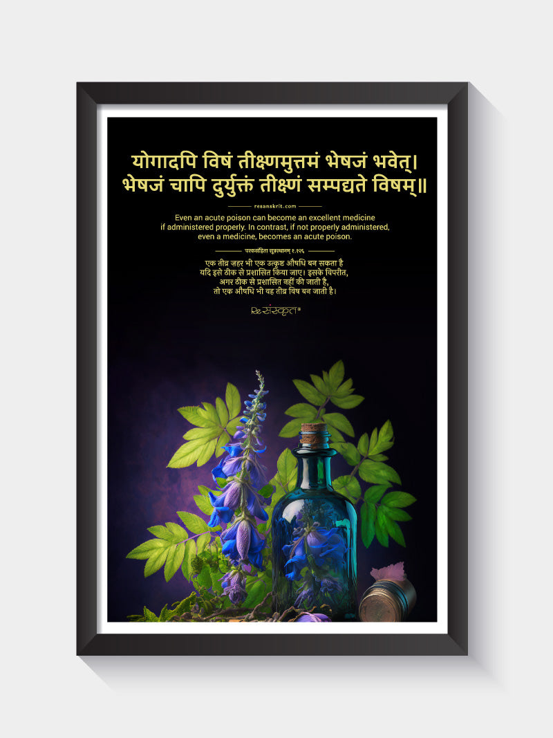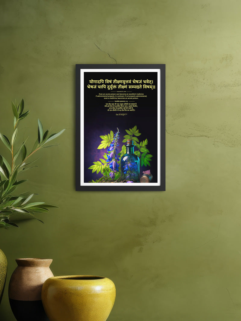 Featuring a profound Sanskrit verse from Charak Samhita on the dual nature of medicine and poison, this frame showcases an elegant botanical and alchemical-themed illustration.