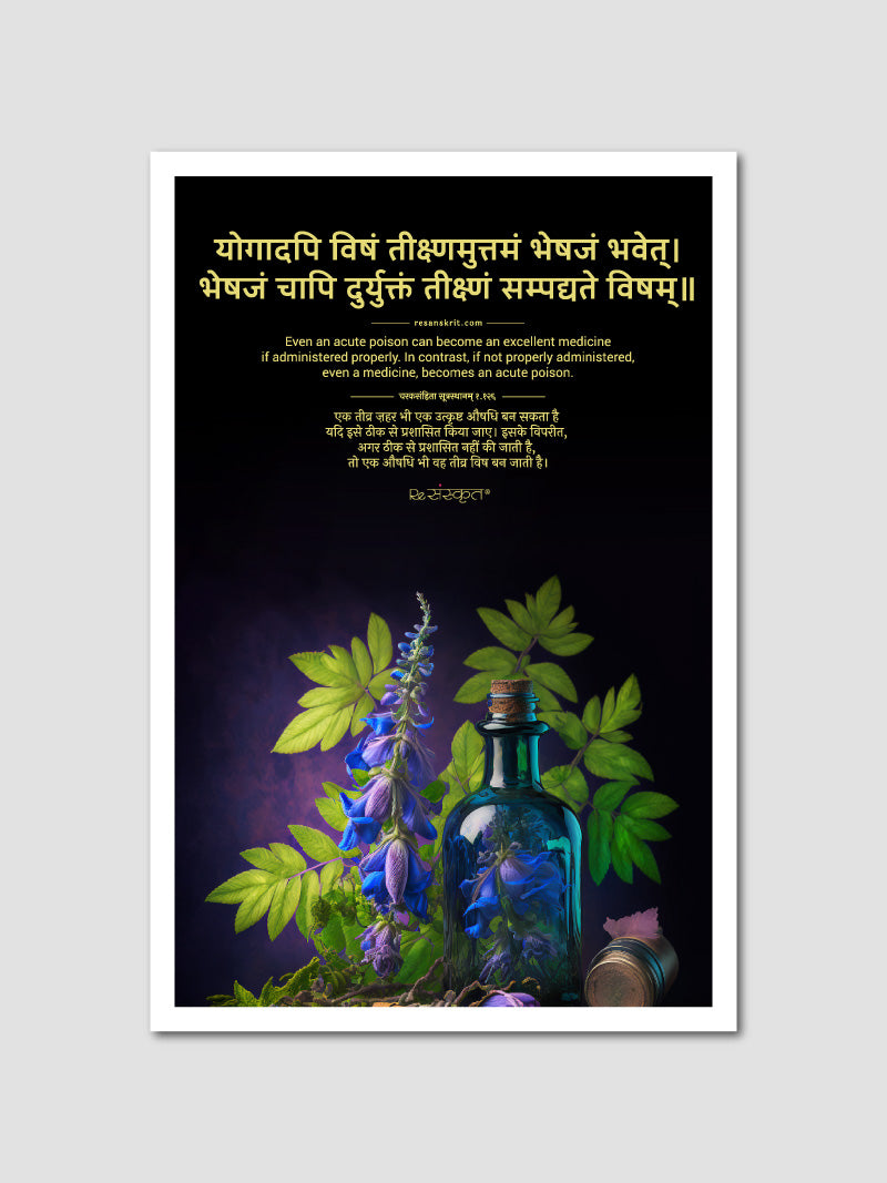 Featuring a profound Sanskrit verse from Charak Samhita on the dual nature of medicine and poison, this poster showcases an elegant botanical and alchemical-themed illustration.
