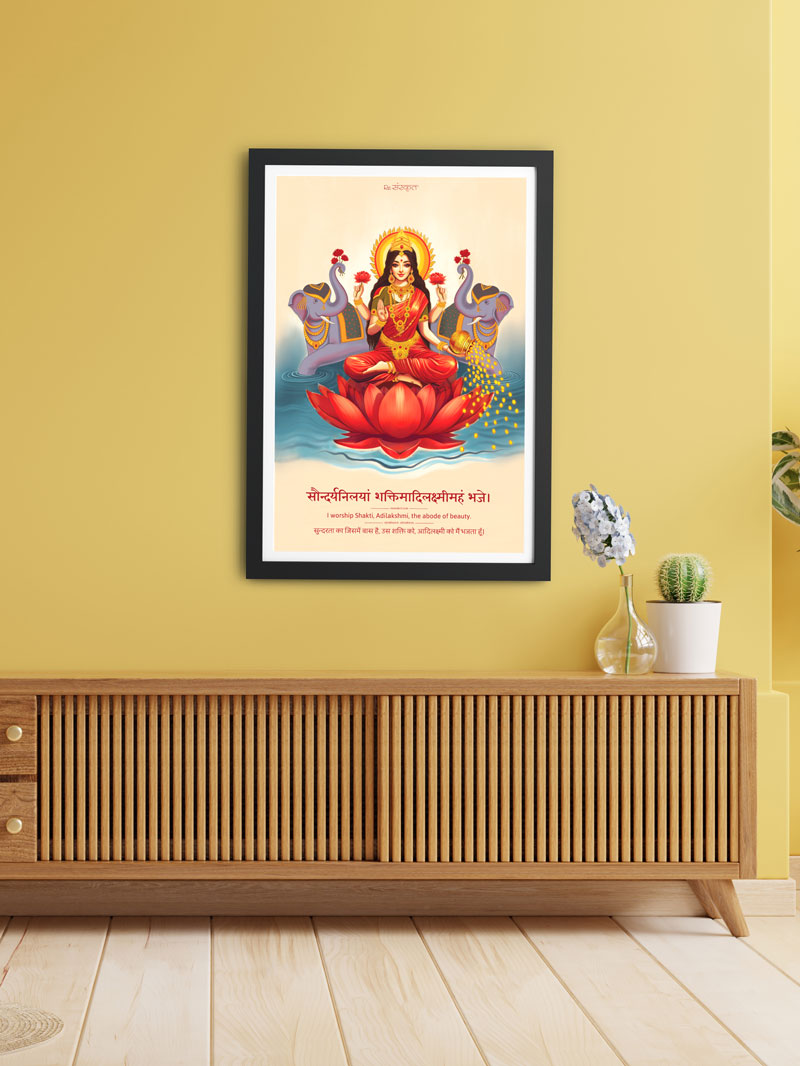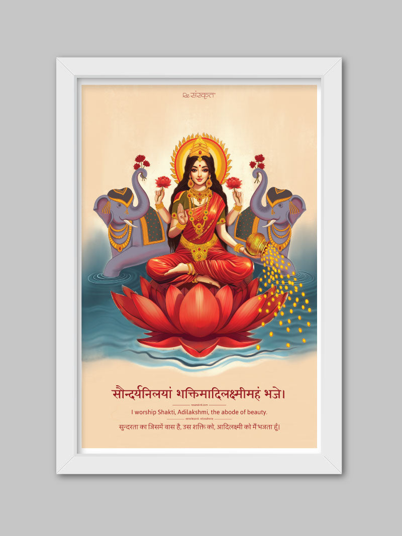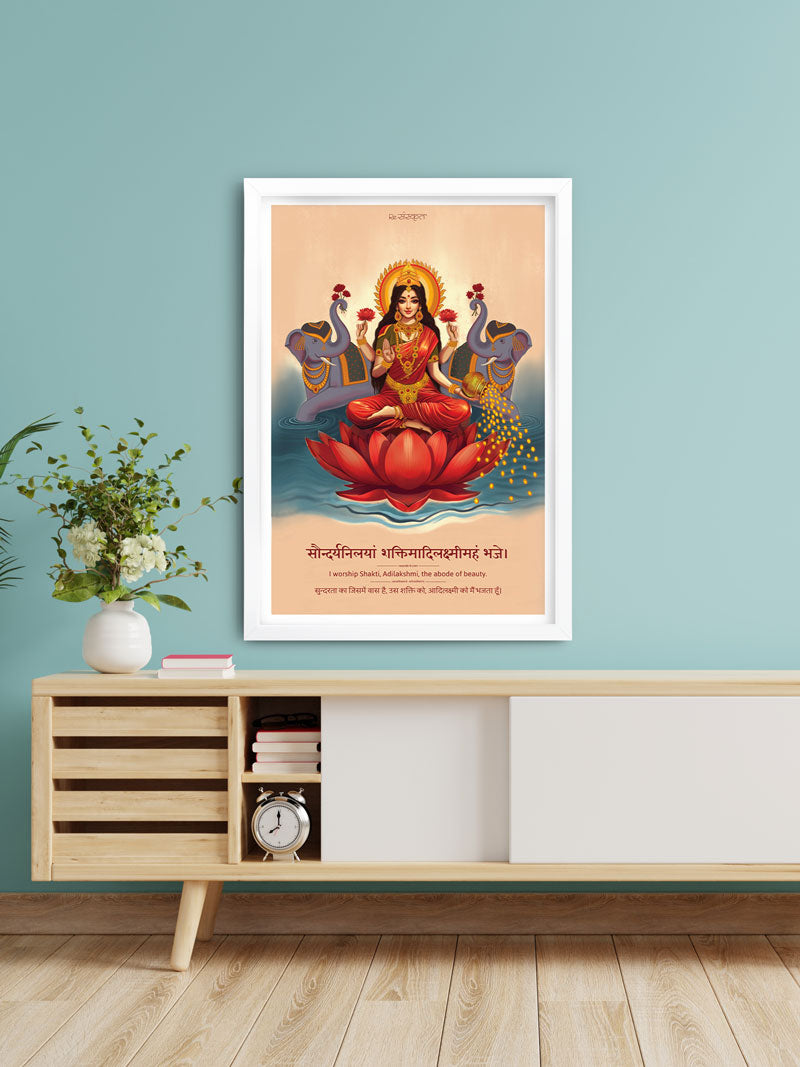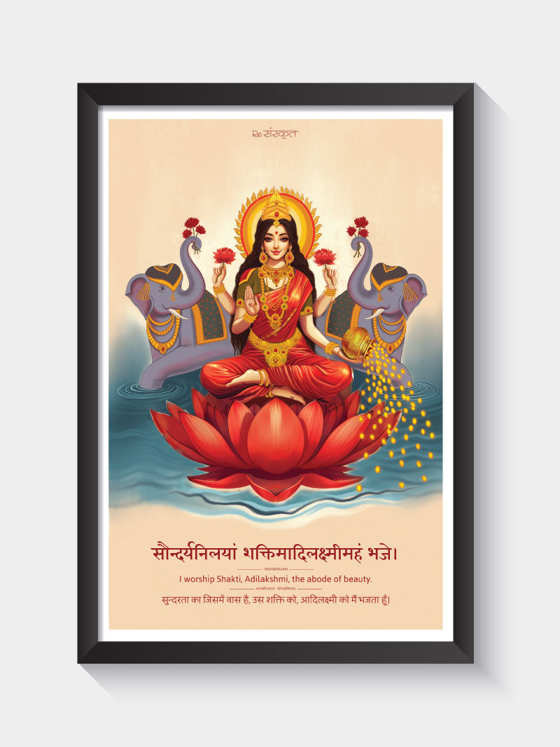 This beautifully designed Sanskrit frame pays tribute to Adi Lakshmi, the supreme Goddess of beauty and prosperity, with an elegant, traditional artwork of Lakshmi Devi. Artwork by - Vaishnavi Naik