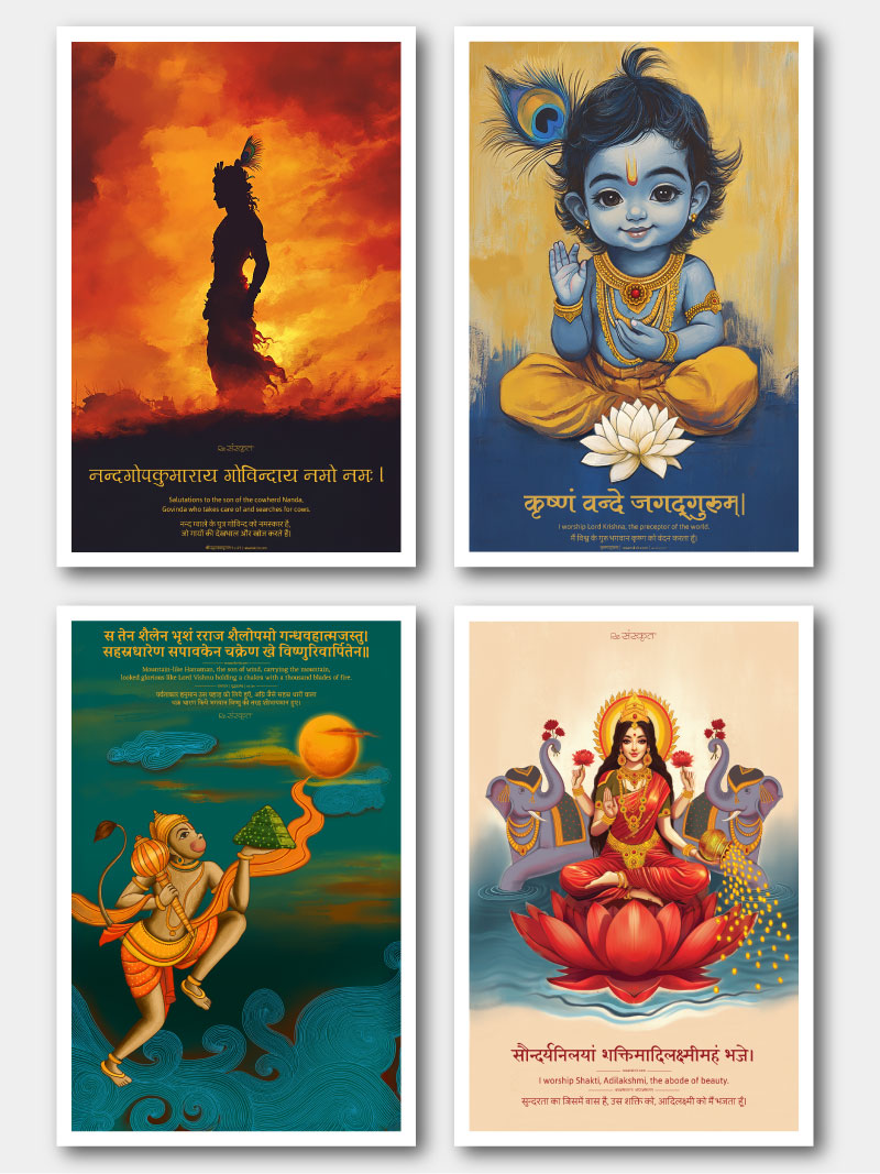 Celebrate devotion through divine art with this 4-poster Sanskrit combo featuring quotes and verses dedicated to Krishna, Hanuman, and Goddess Lakshmi. Perfect for home temples, puja rooms, and spiritual gifts.
