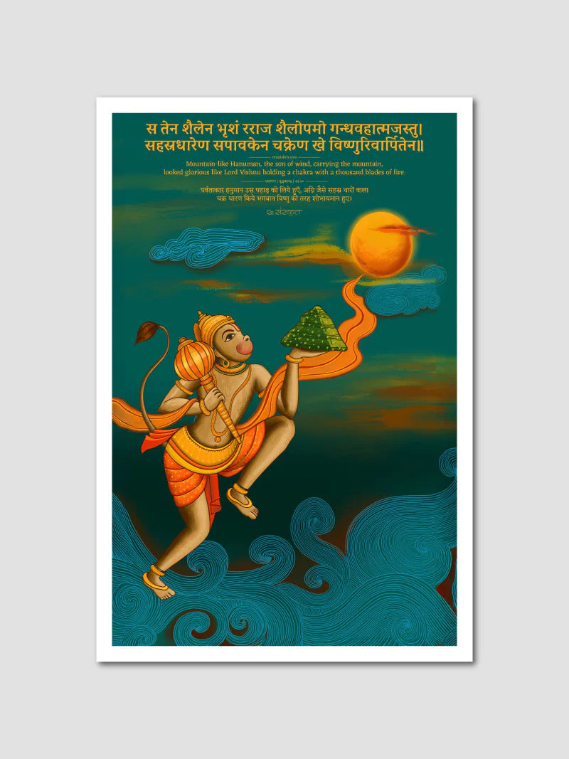 पर्वताकार हनुमान उस पहाड़ को लिये हुएँ, अग्नि जैसे सहस्र धारों वाला चक्र धारण किये भगवान विष्णु की तरह शोभायमान हुए।