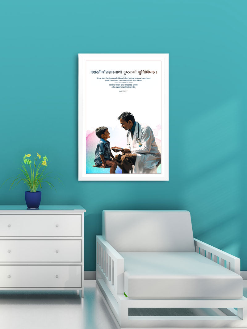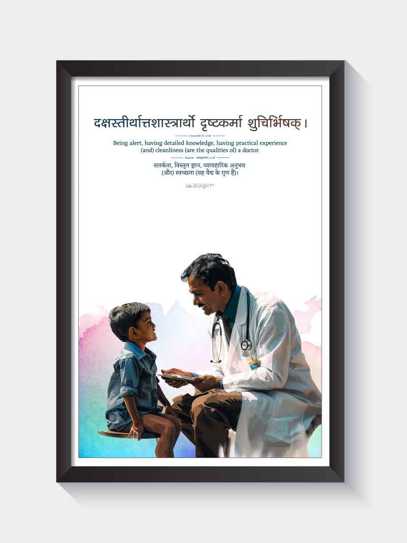 A beautifully illustrated artwork featuring a Sanskrit verse emphasizing the essential qualities of a doctor—knowledge, practice, cleanliness, and alertness.