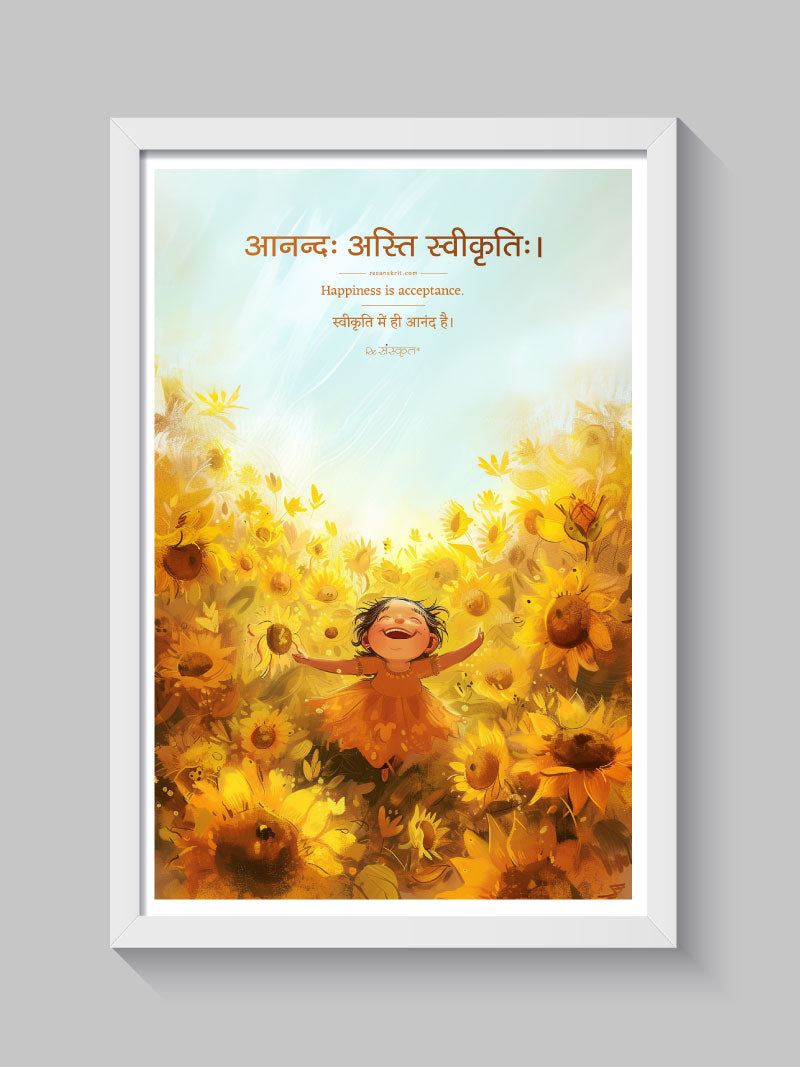 Brighten your space with this uplifting frame featuring a joyful child amidst a field of sunflowers. With a powerful Sanskrit phrase translating to "Happiness is acceptance," this artwork radiates positivity and warmth. Perfect for homes, offices, and mindfulness spaces.