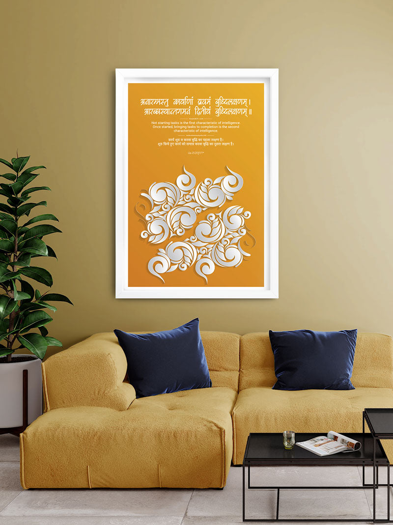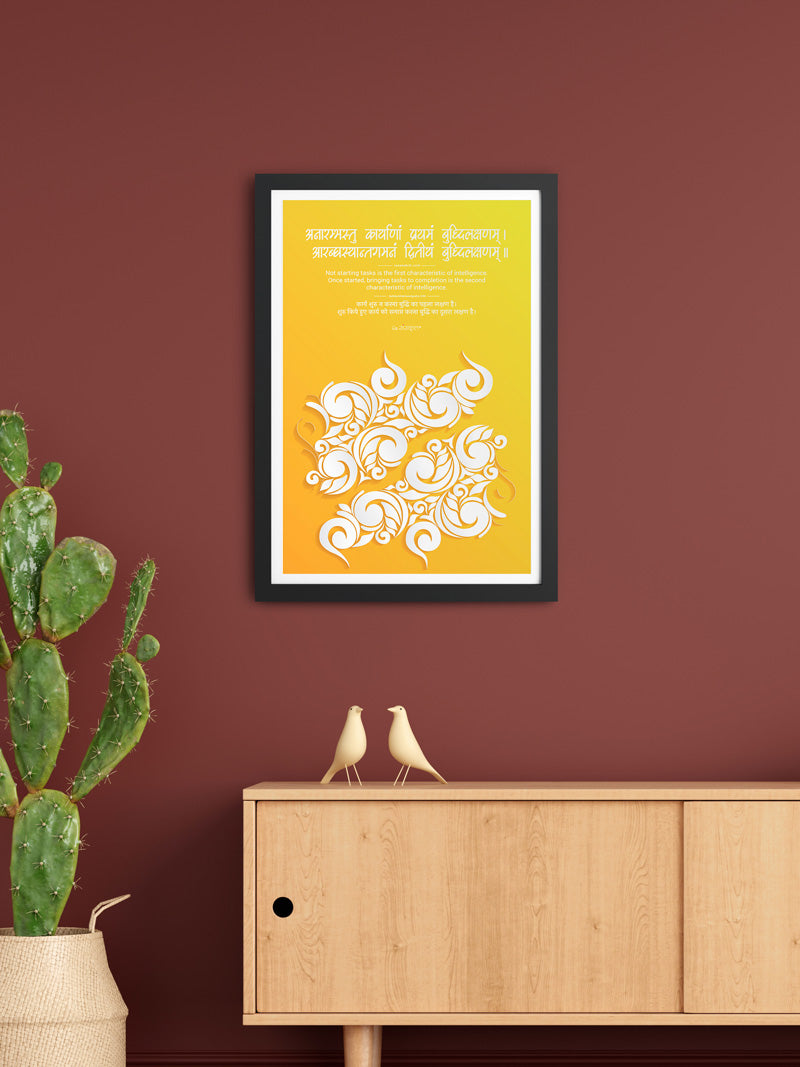 A Sanskrit verse emphasizing that knowing when to start and complete a task is the sign of intelligence, presented with a modern abstract design for elegant office or study decor.