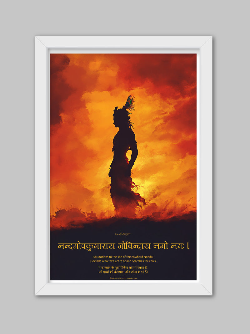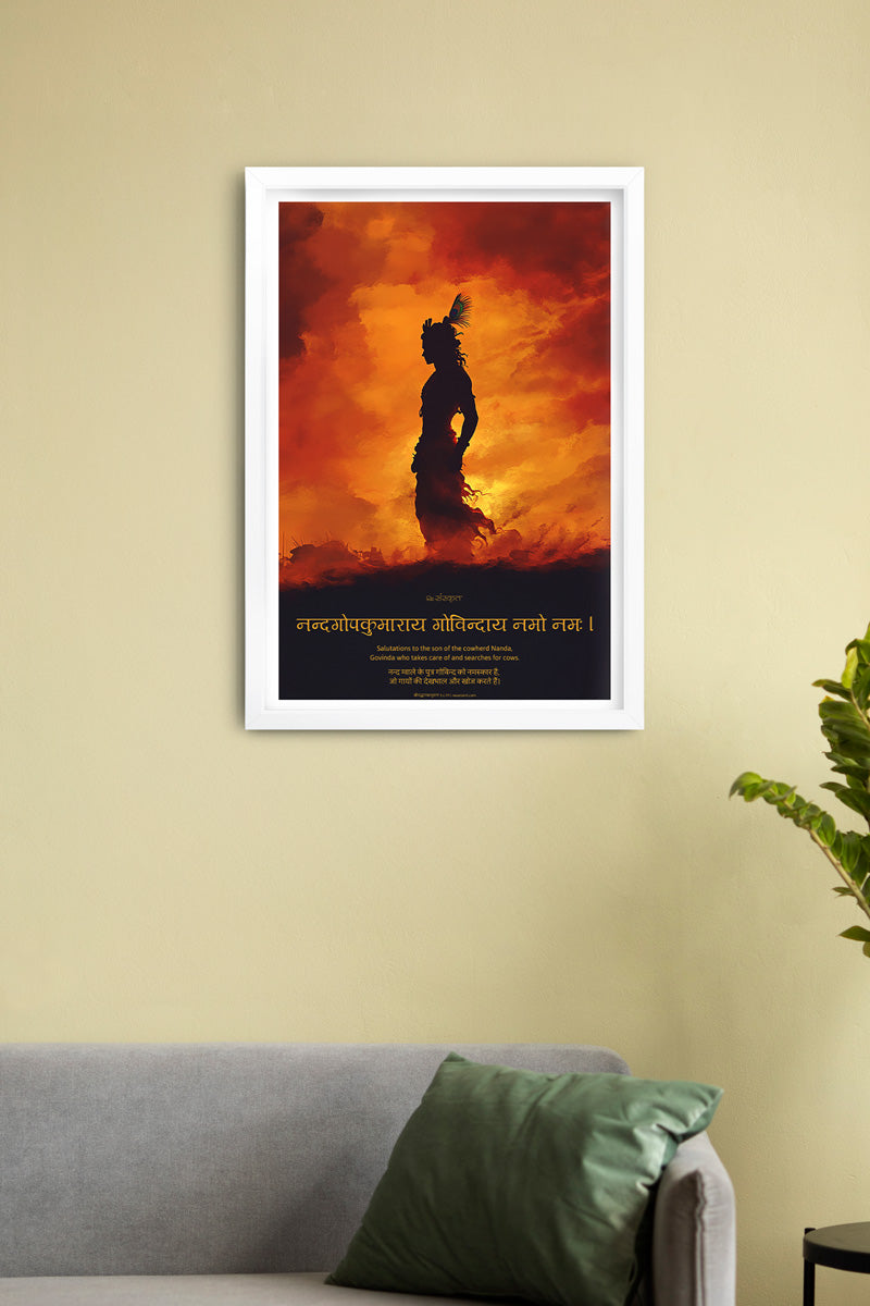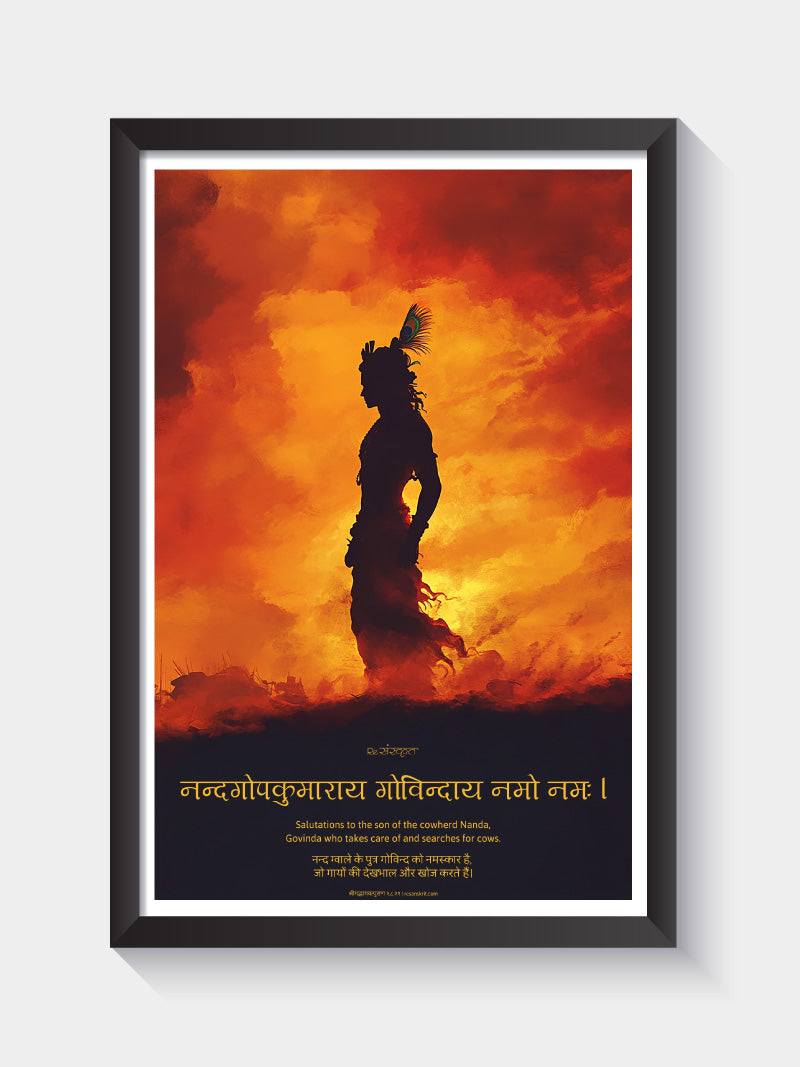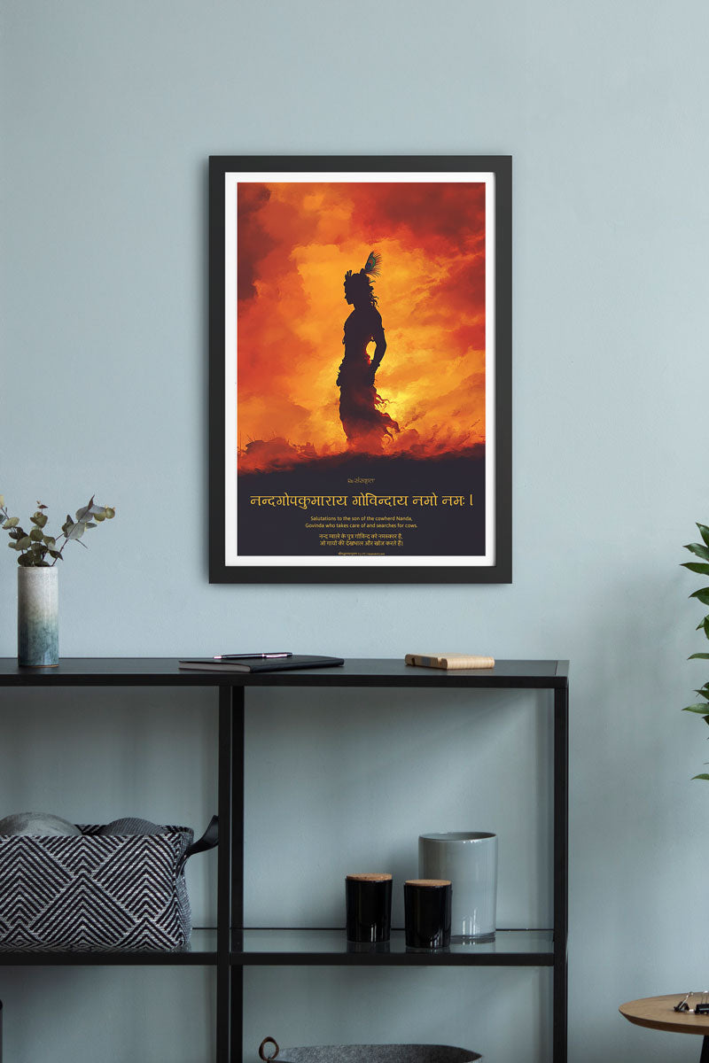 This breathtaking artwork captures Shri Krishna in a powerful silhouette against a blazing backdrop, symbolizing his divine brilliance. The accompanying Sanskrit verse exalts Krishna as an immeasurable presence, like the fire and the sun. A perfect addition for spiritual seekers, devotees, and artistic decor.