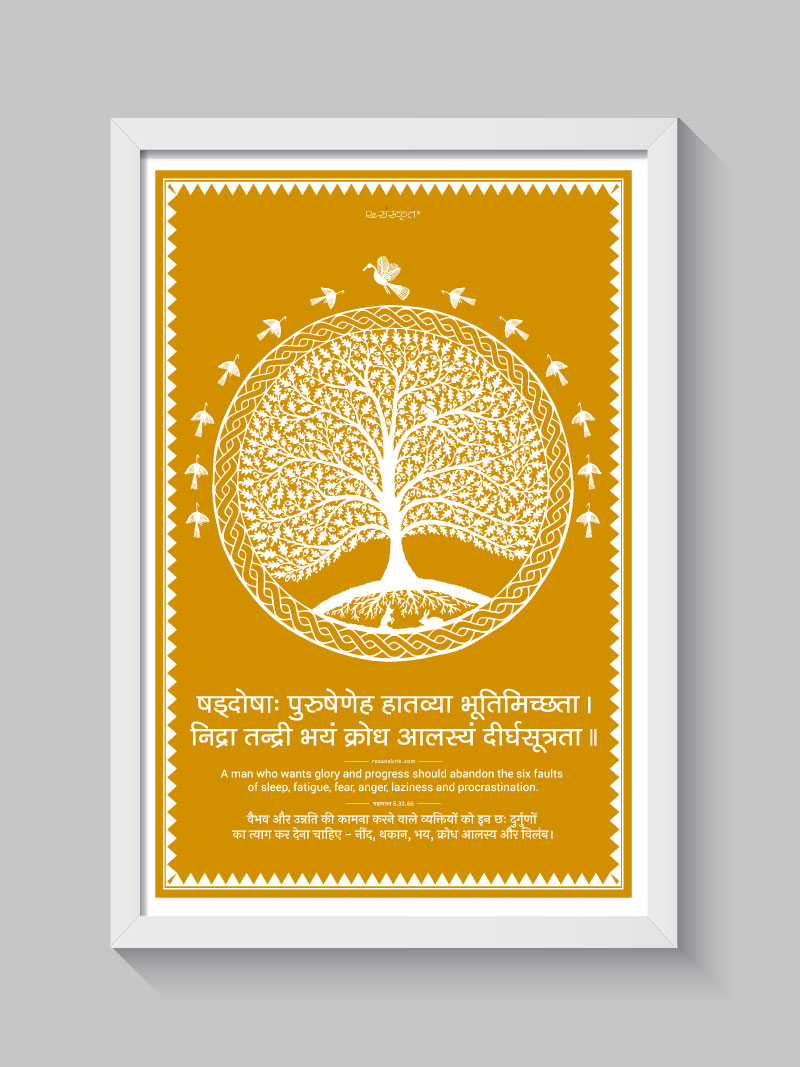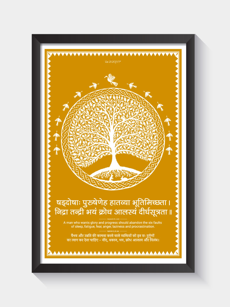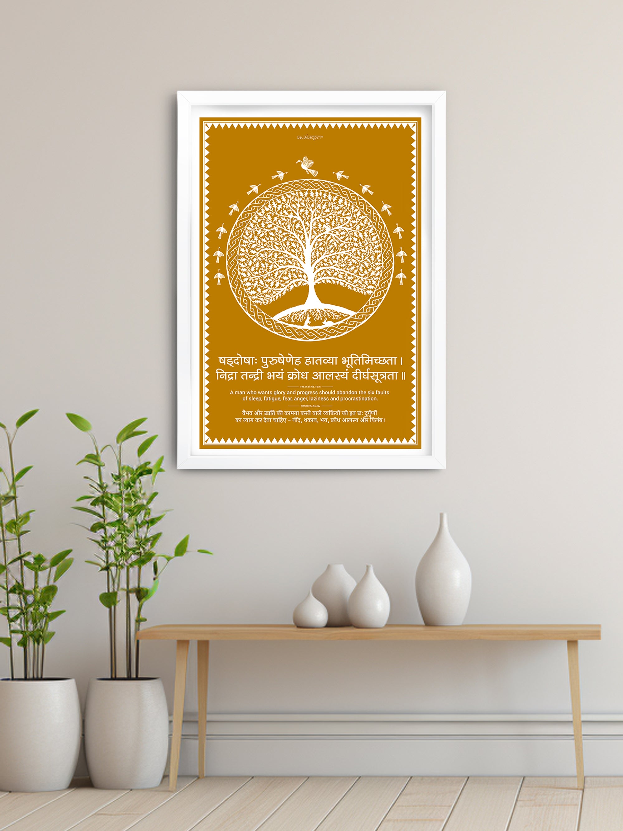 Elevate your living or workspace with this beautifully designed motivational wall art, featuring a traditional tree of life illustration and an inspiring Sanskrit quote from Mahabharat. The quote encourages abandoning the six faults—sleep, fatigue, fear, anger, laziness, and procrastination—to achieve glory and progress. Perfect for those who seek daily inspiration, this wall frame is crafted in earthy tones, adding a serene and motivational touch to any room. Ideal for homes, offices, or meditation spaces.