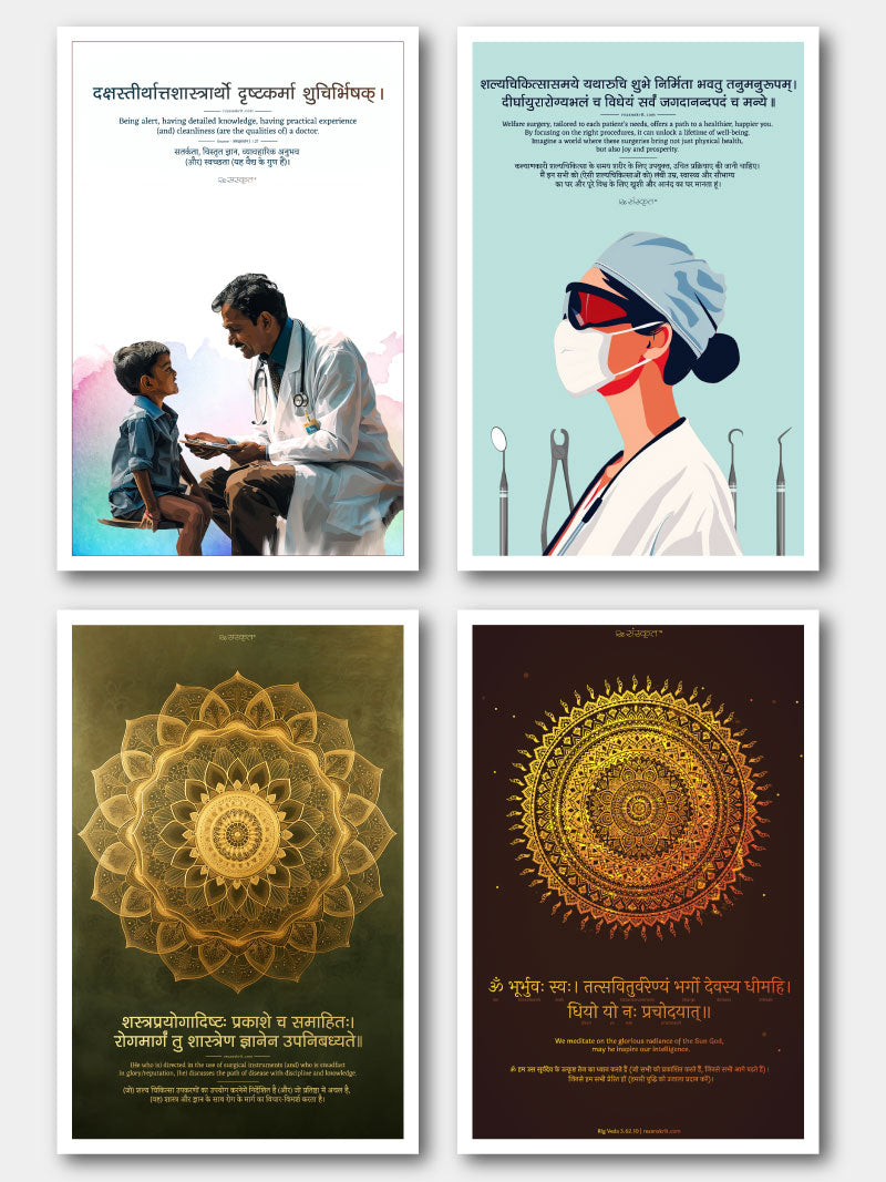 A powerful Sanskrit poster combo designed to uplift clinics, hospitals, and medical institutions — featuring verses on knowledge, healing, and the noble virtues of healthcare professionals.