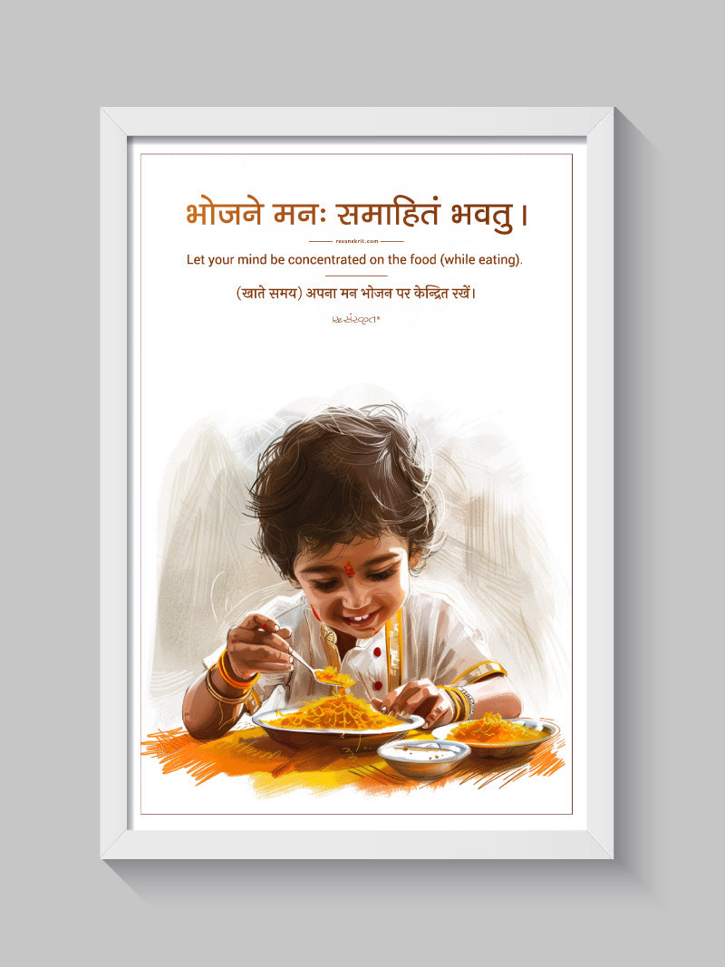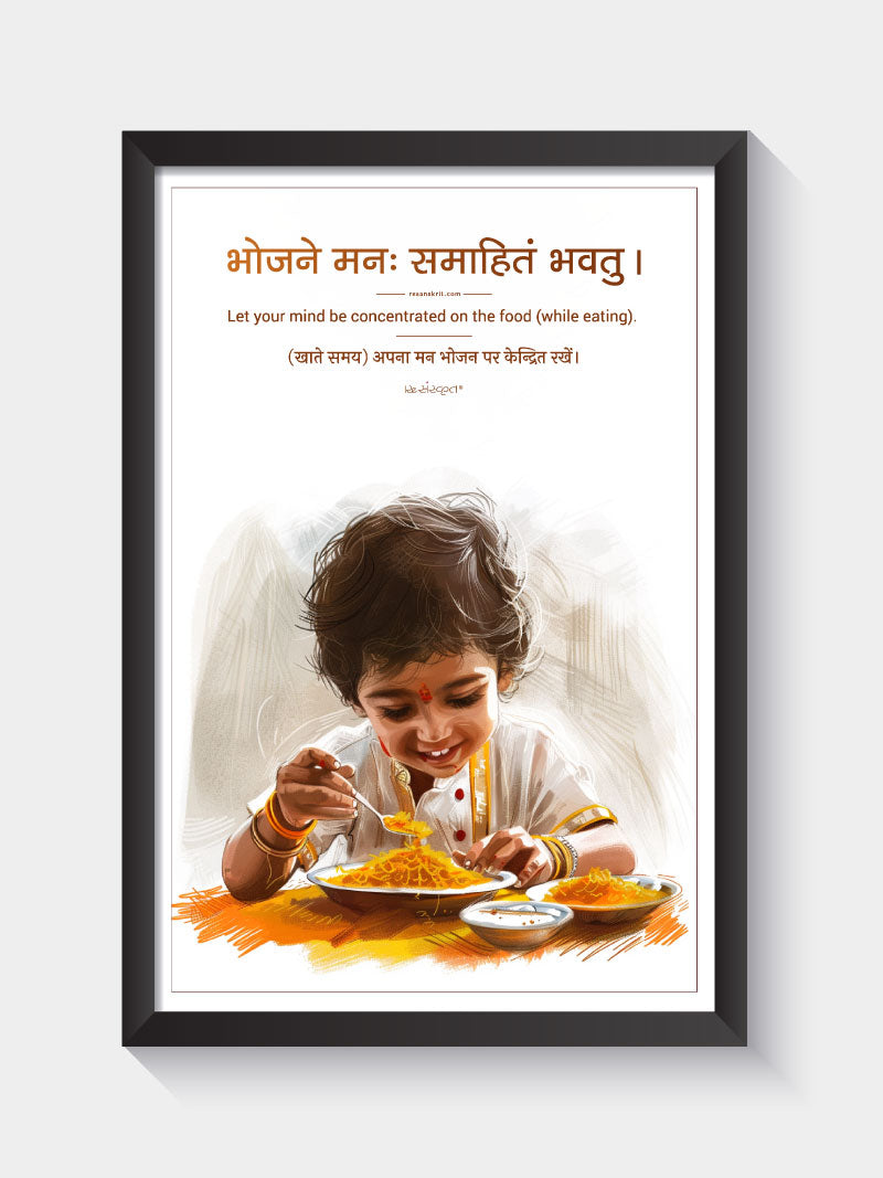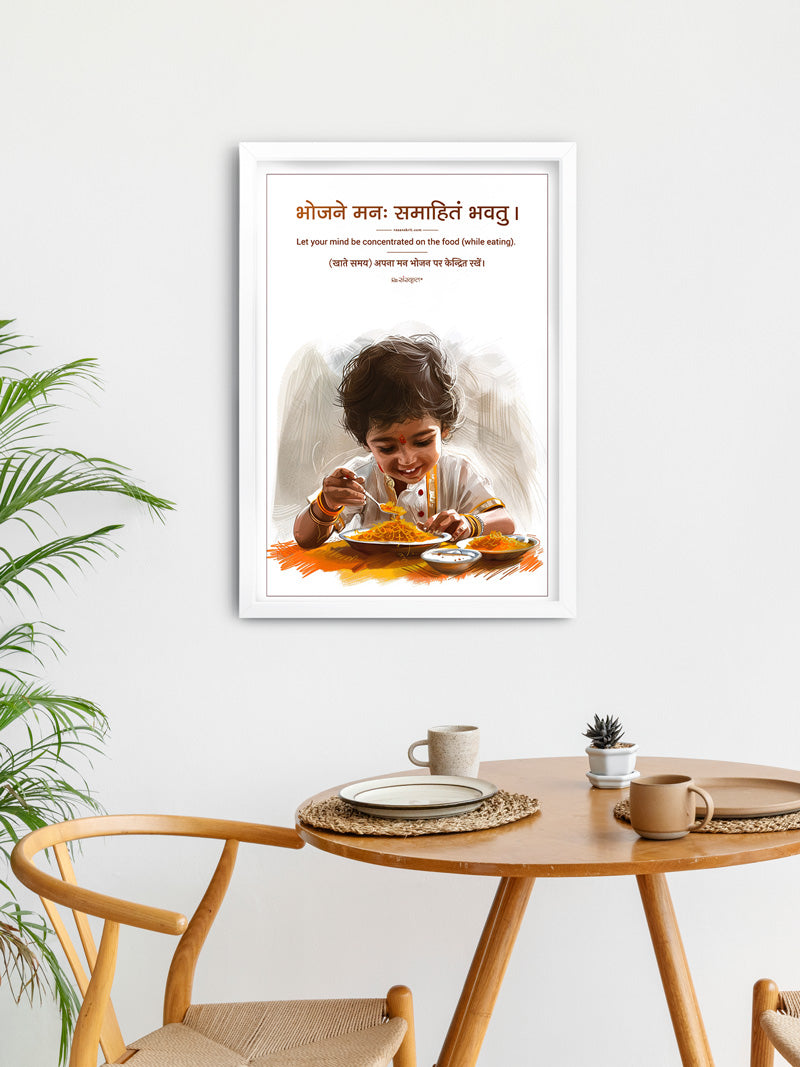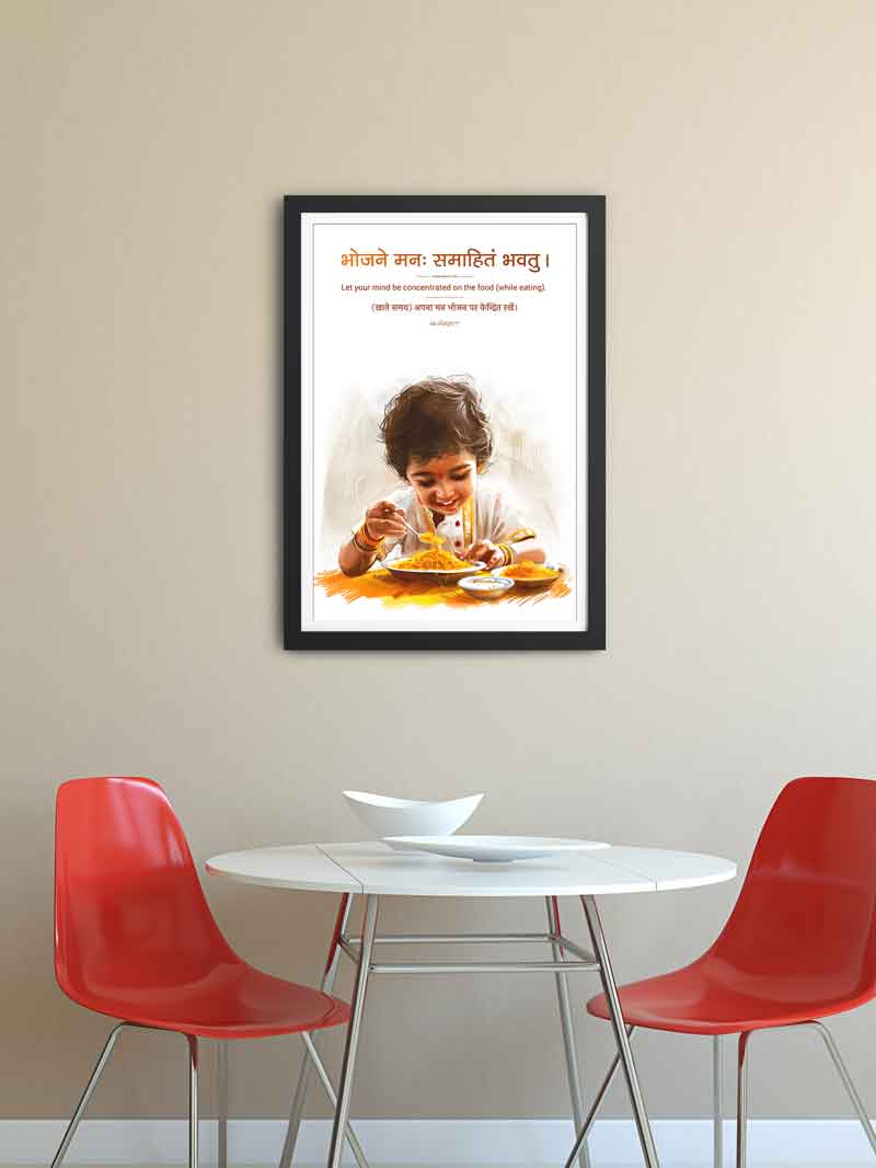 Enhance your dining experience with our beautifully illustrated "Mindful Eating Inspirational Frame." Featuring a charming depiction of a child enjoying a meal, this poster includes the motivational quote "Let your mind be concentrated on the food (while eating)" in both Sanskrit and English. Perfect for kitchens, dining areas, and classrooms, this frame encourages mindfulness and gratitude during mealtime. Printed on high-quality paper, it adds a touch of cultural elegance to any space.