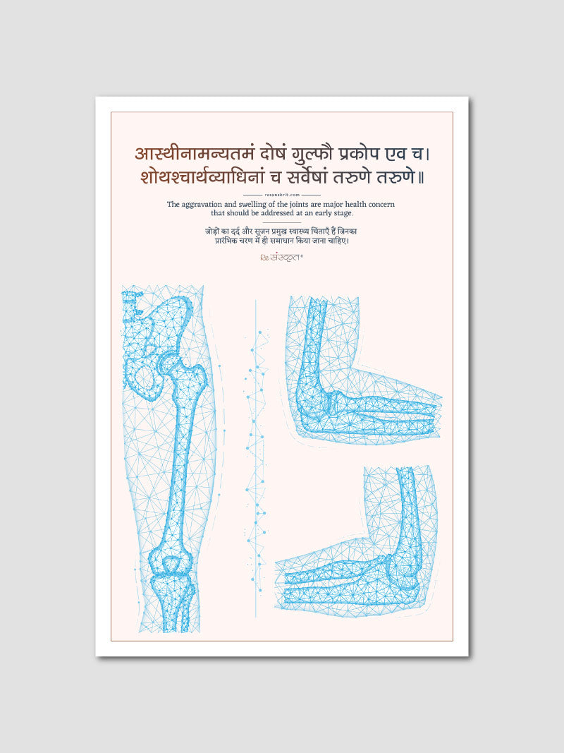 This insightful Sanskrit poster discusses the impact of joint swelling and musculoskeletal issues, complemented by a unique wireframe anatomical illustration.
