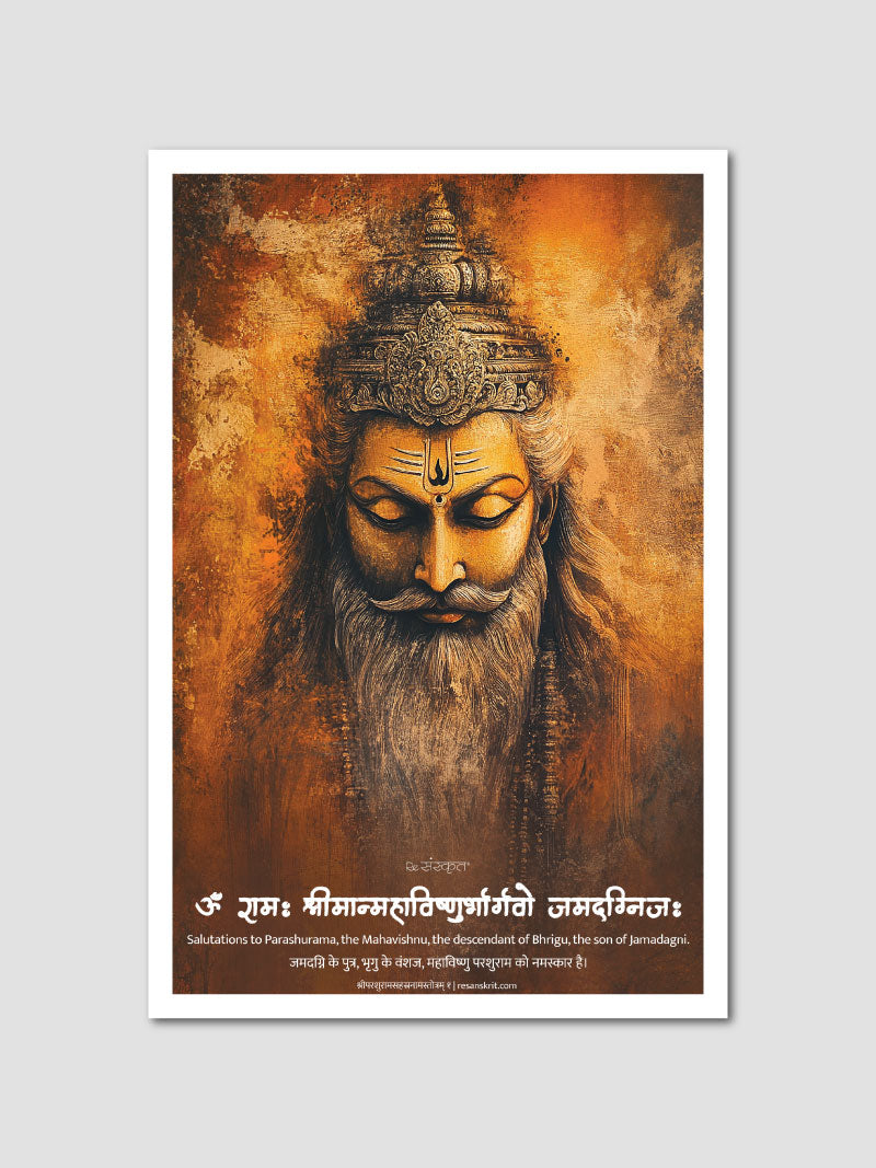 Invoke the power of Bhagwan Parashurama, the warrior incarnation of Vishnu, with this striking poster. The intense artwork, paired with a Sanskrit verse honoring his lineage and strength, makes this a perfect addition for devotees, warriors of Dharma, and spiritual spaces.