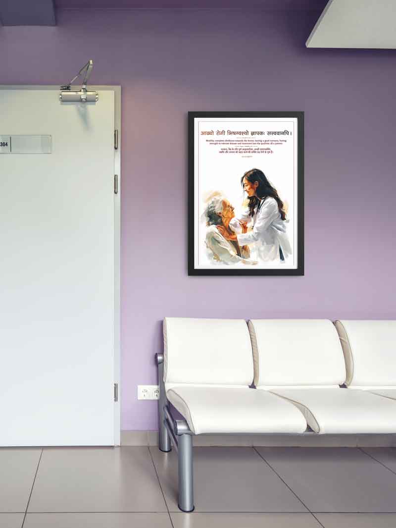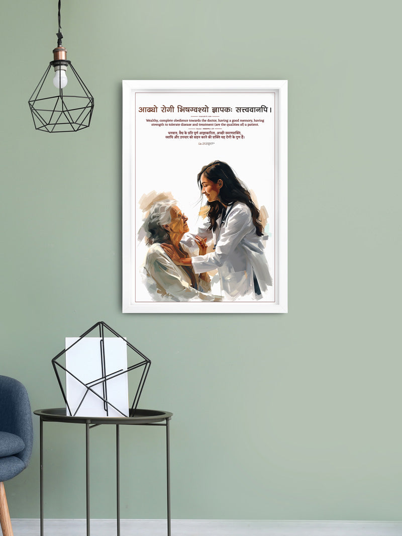 Featuring a profound Sanskrit verse on the ideal qualities of a patient, this frame includes a compassionate illustration of a doctor and an elderly patient, perfect for clinics and hospitals.