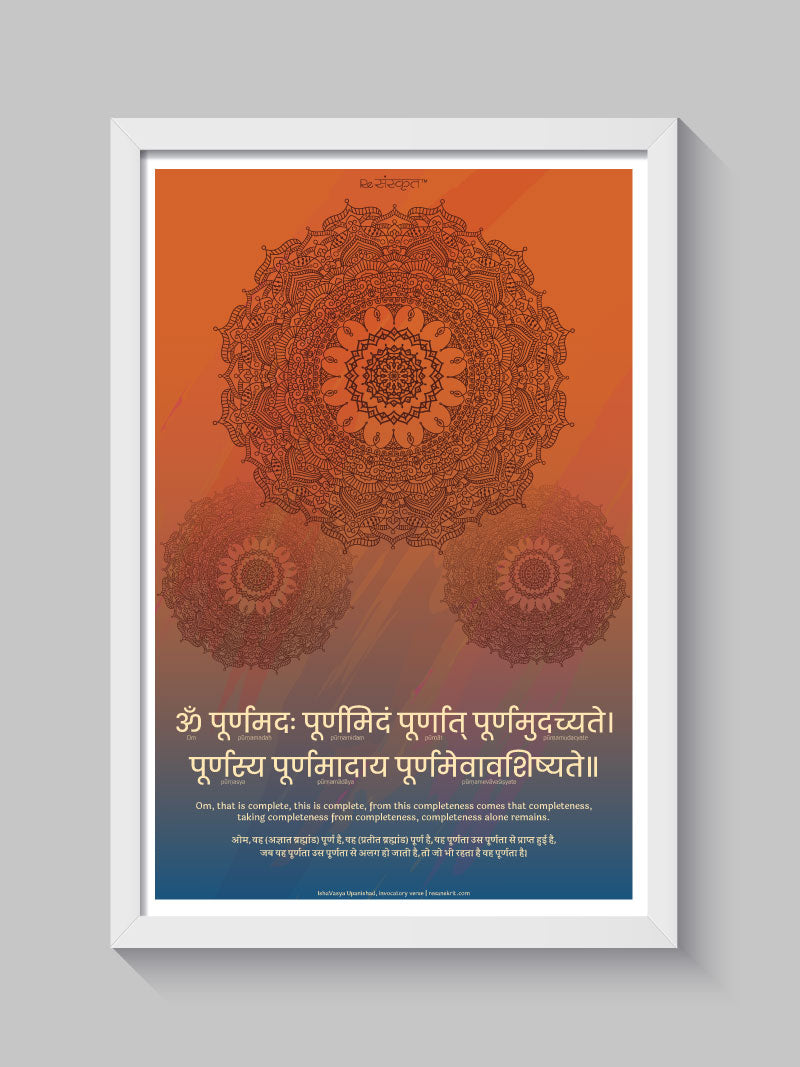 This beautiful Shlok is the invocatory verse of the Ishavasya Upanishad which is also a popular prayer. Rakesh Om Prakash Mehra has used this in the intro video of all of his movies. An illustration made of mandalas depicts the completeness of the universe. A complete gift to your wall or friends.