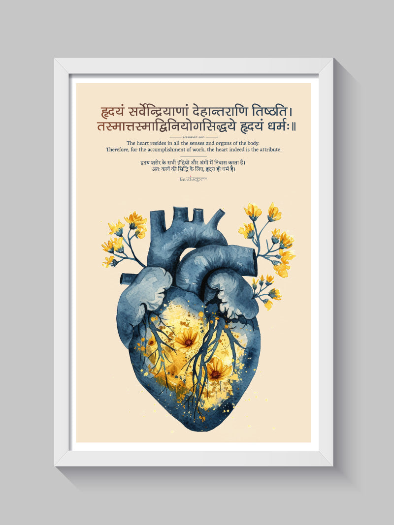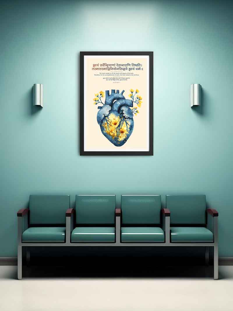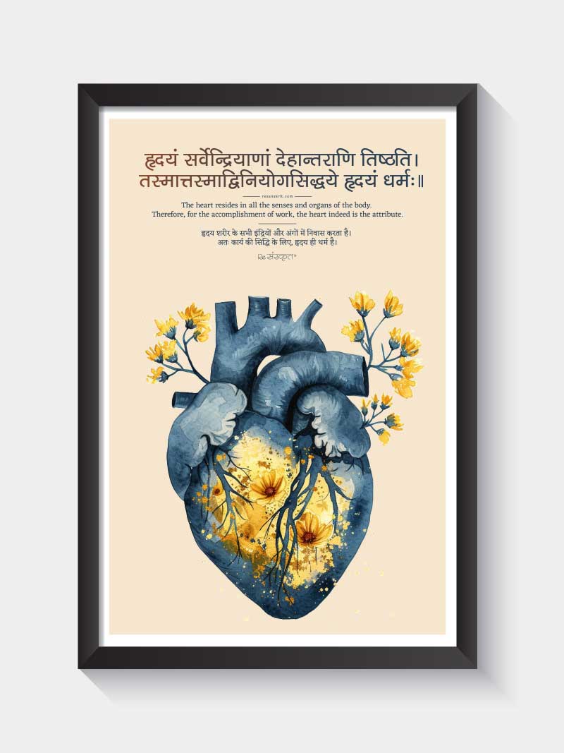 A beautifully illustrated Sanskrit frame featuring a verse on the significance of the heart, paired with an artistic heart illustration, perfect for cardiology clinics and hospitals.