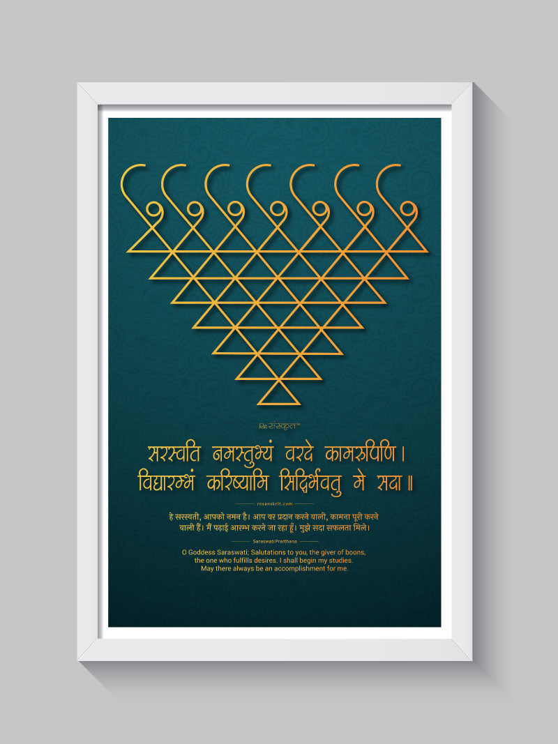 The Shloka that we chanted as a prayer in our childhood. A prayer which has a deep and humbling meaning. Paired with a classic Saraswati Yantra. This artwork belongs in your study or office.