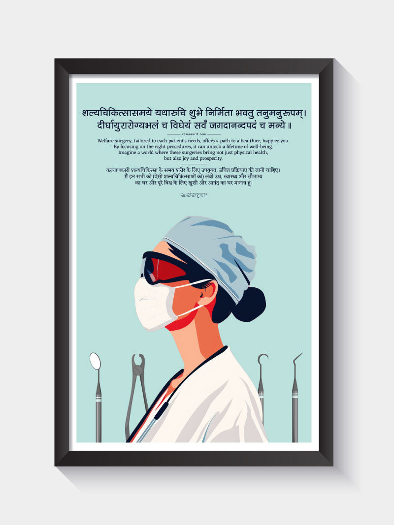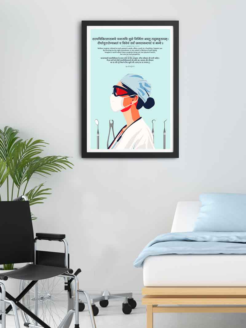 Featuring a Sanskrit verse on the significance of welfare surgery and healing, this frame showcases a bold illustration of a surgeon, ideal for surgical clinics and hospitals.