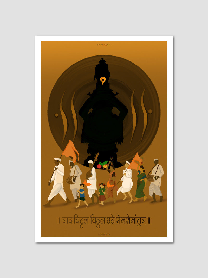 Vithhal or Vithoba is a form of the god Vishnu, or his avatar Krishna. Vithoba is often depicted as a dark young boy, standing arms akimbo on a brick. Just as Varkari Sampraday and our beloved Vithoba are inseparable, this portrait beautifully features both. The artwork is developed by our artist Vaishnavi Naik.