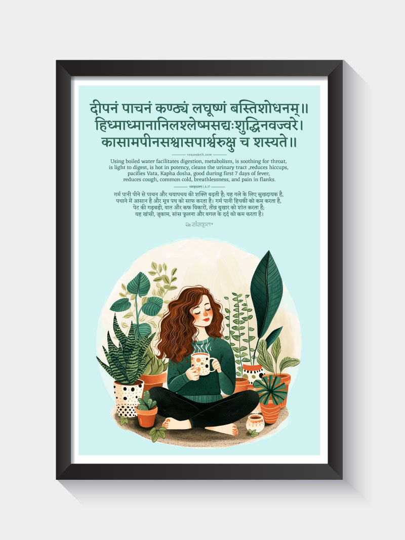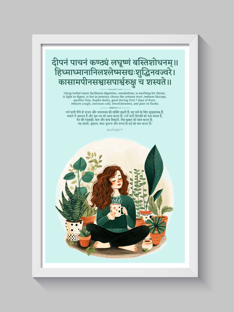 A Sanskrit verse on the healing properties of warm water, paired with an artistic and calming illustration, perfect for Ayurvedic and holistic health spaces.
