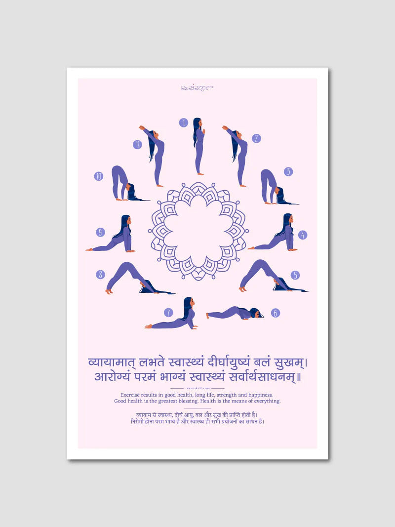 Enhance your yoga practice with this beautifully designed Surya Namaskar poster. Featuring step-by-step illustrations of the sun salutation sequence and a powerful Sanskrit verse on health and well-being, this poster is perfect for yoga studios, home practice, and wellness spaces.